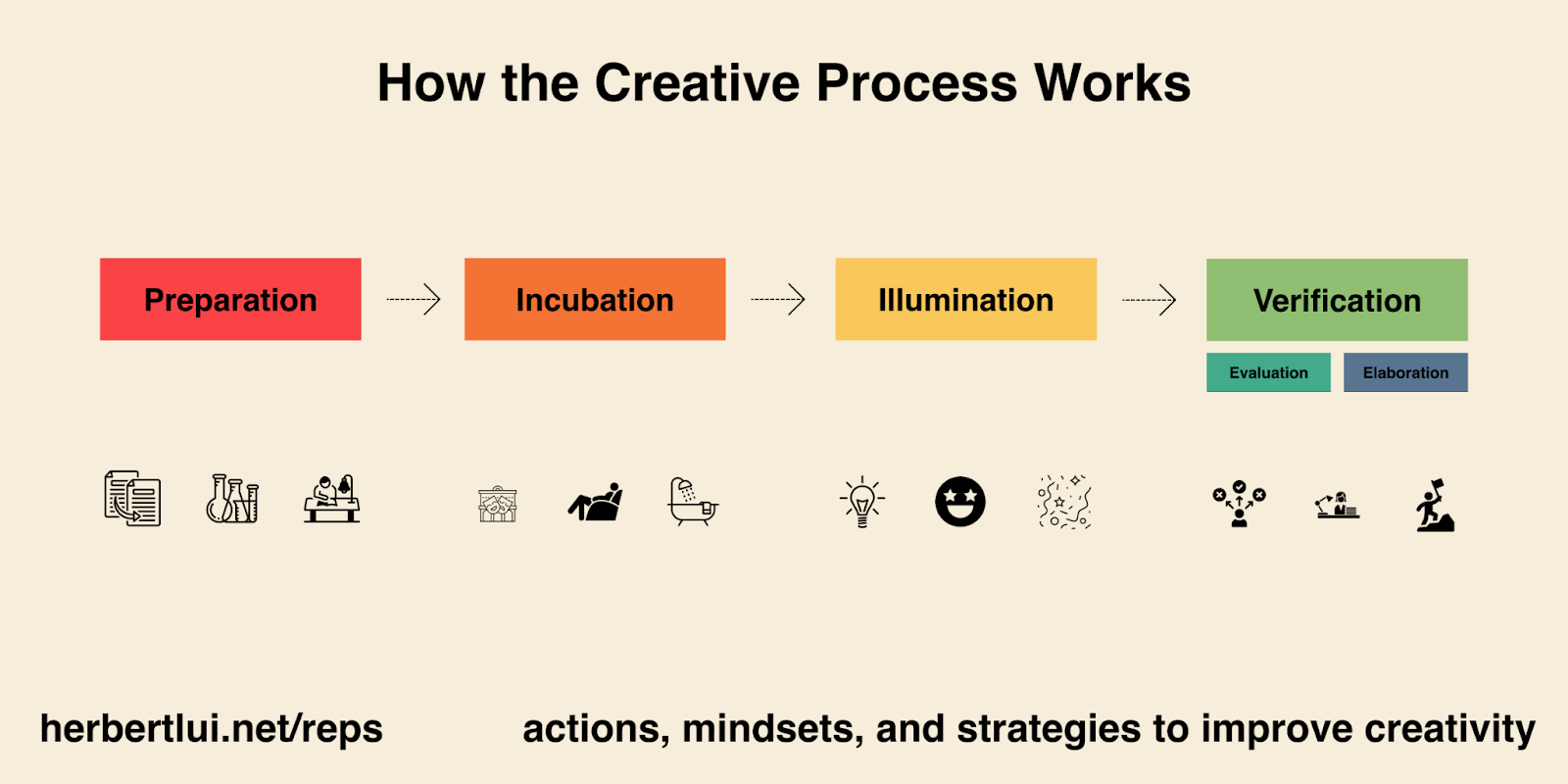 However, after these three steps you've got an idea, sure, but there's more to creativity than just thinking. That's where Graham Wallas comes in. He was the first to actually create an overview of the Creative Process, as illustrated below.