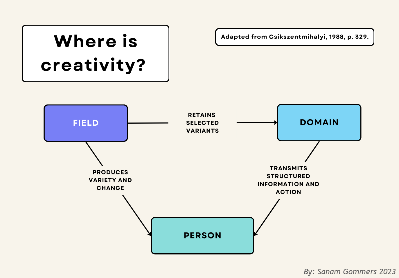Csíkszentmihályi came to that same conclusion and so instead of asking what creativity is, he asked the people in his case studies where creativity is. The results that followed consistently had a field, domain and person in them, creating the foundations for the Social Systems Model of creativity, as illustrated below.